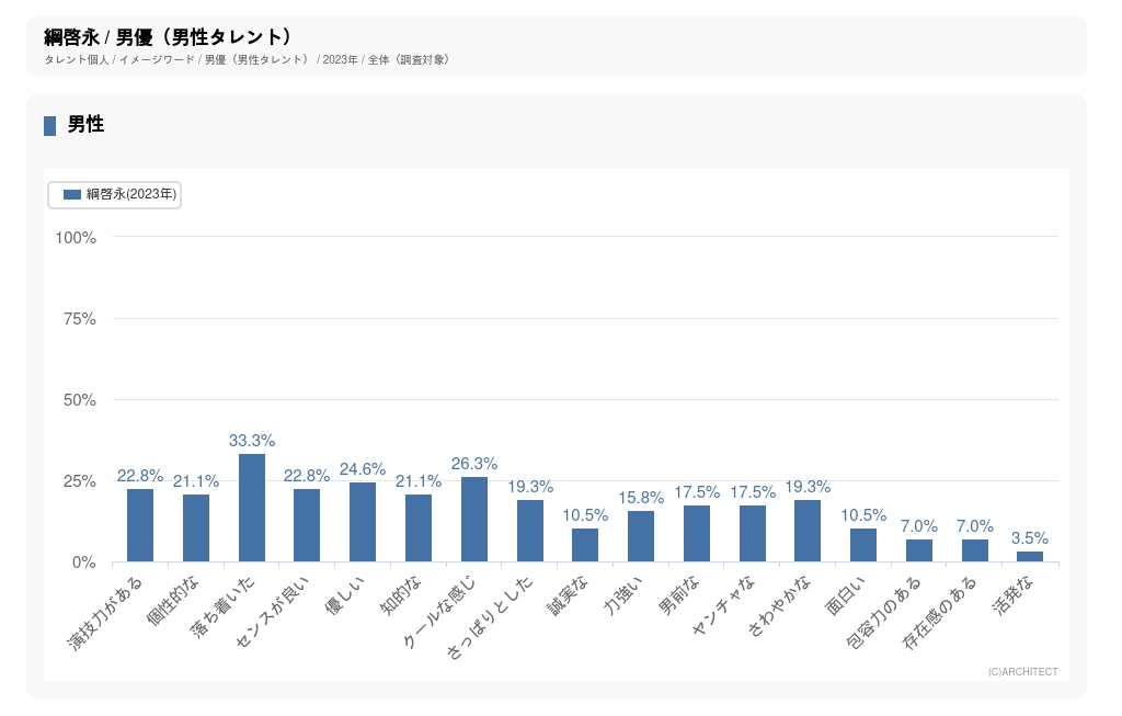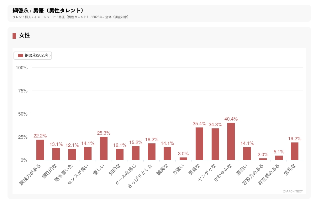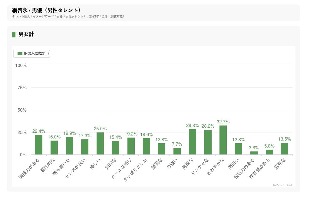 ──タレントパワーランキングではそれぞれの俳優やタレントに、世間がどのようなイメージを抱いているかを調べるイメージワード調査というものを実施しています。こちらが、綱啓永さんのイメージワード調査の全体と男女別の結果になります。