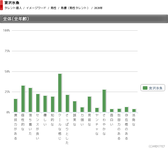 ――――では、ここで、タレントパワーランキングについてお尋ねします。一般の方に宮沢氷魚さんのイメージワードを調べてみたところ、1位は「クールな感じ」47.2ポイント、2位は「個性的」32.5ポイント、3位は「落ち着いた」29.7ポイント、そして4位が「さわやかな」で27.6ポイントです。特に、「クールな感じ」は女性でより顕著ですね。この結果は、どのように感じましたか。